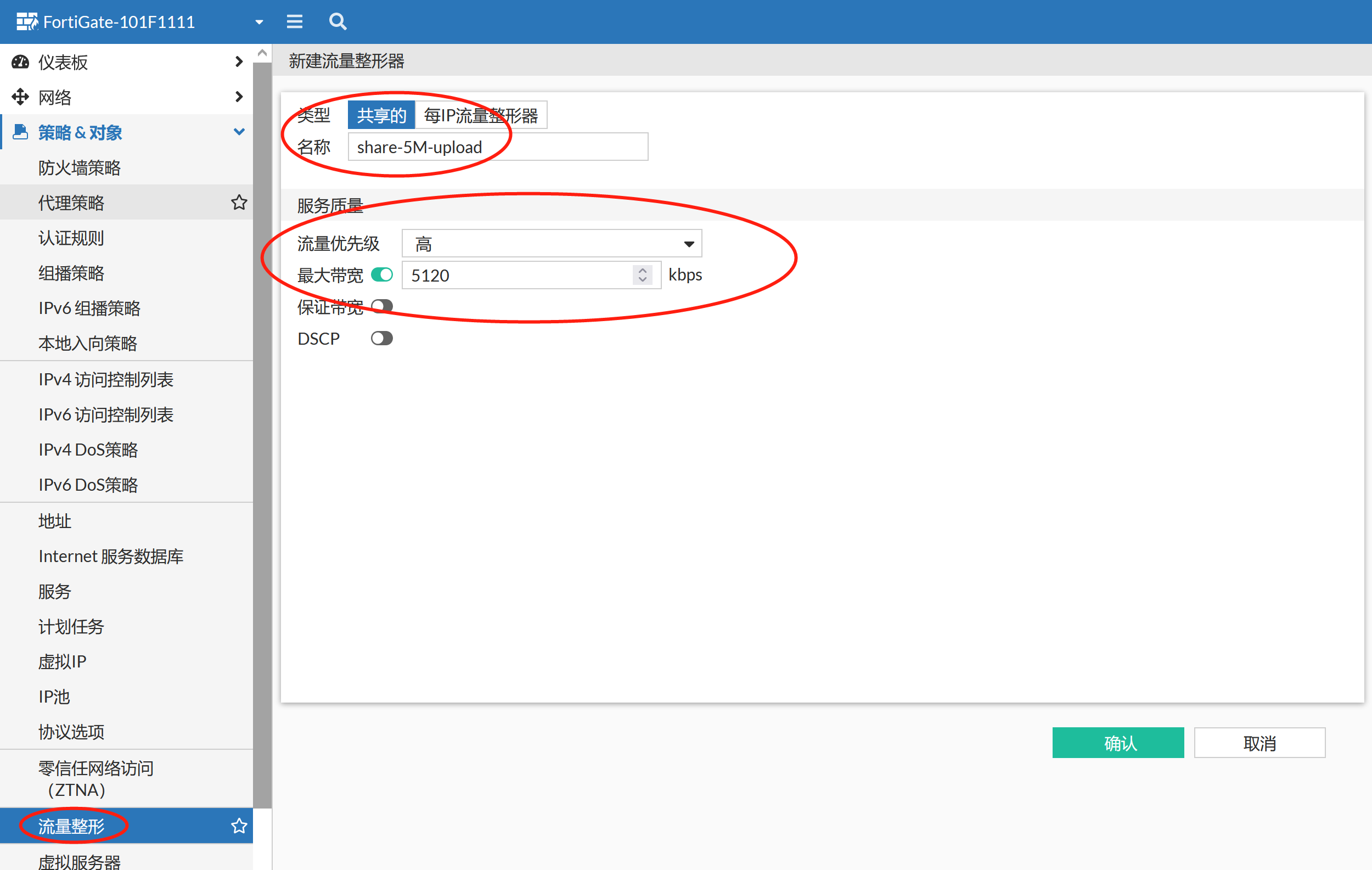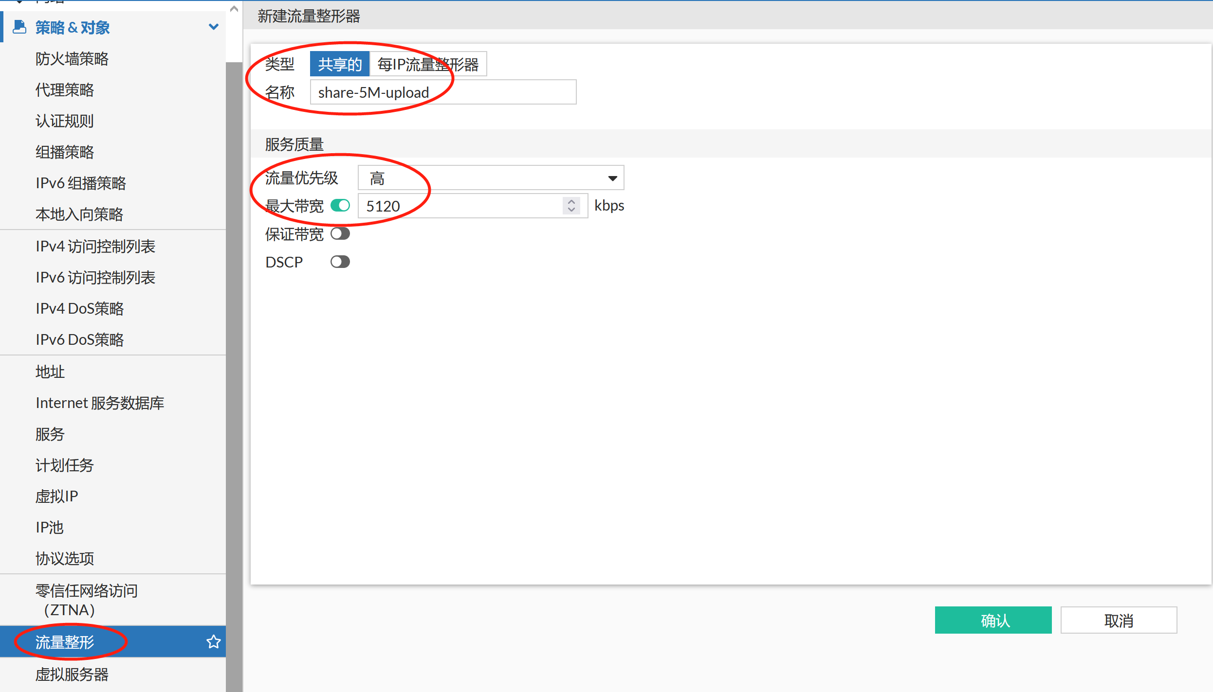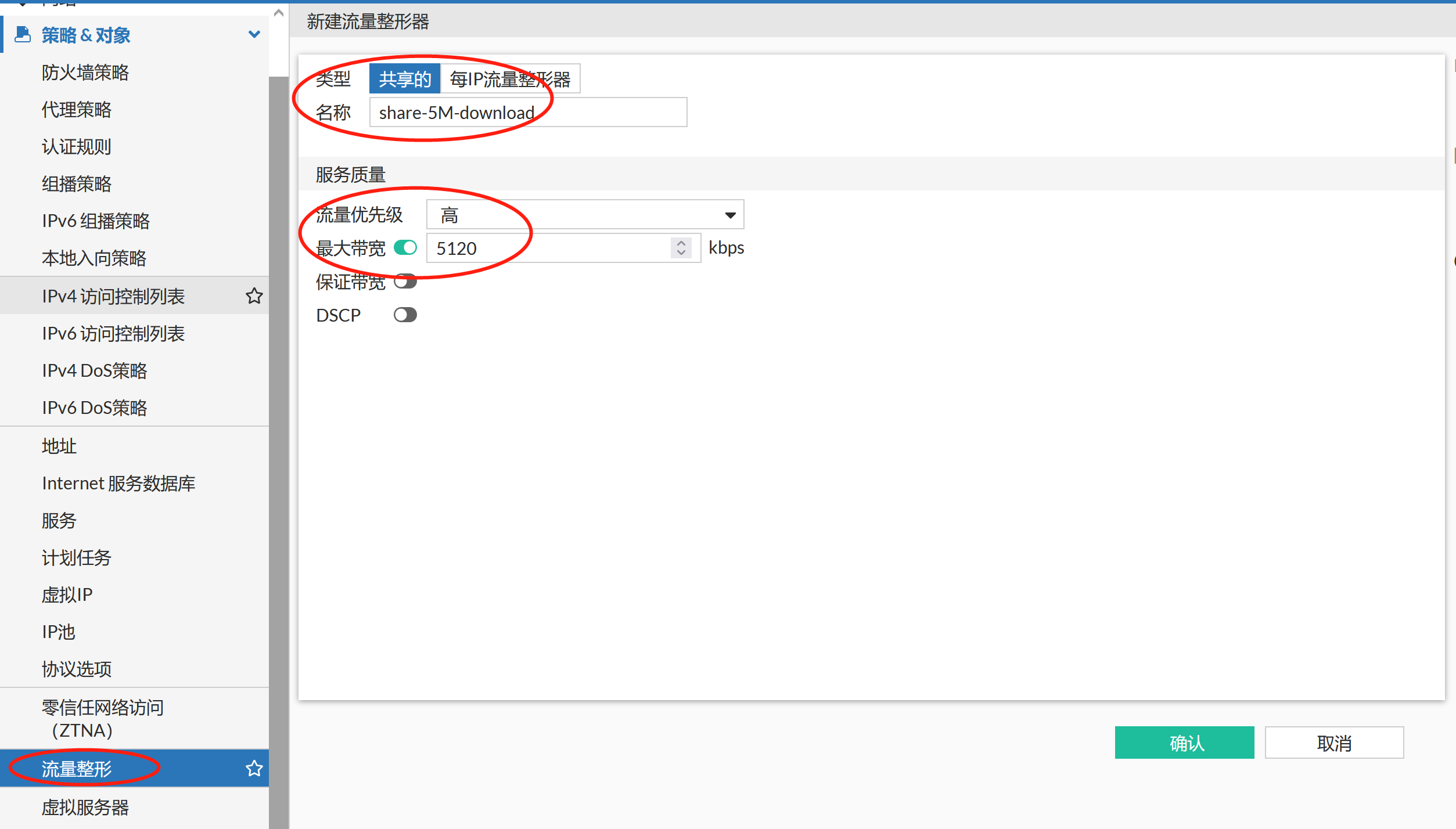 注意:如果需要上传和下载限速分别配置为5M,需要分别配置上传和下载的traffic shaper。如果上传和下载引用了同一个traffic shaper,则上传和下载会共享1个5M。
