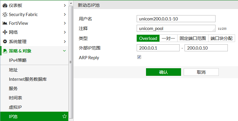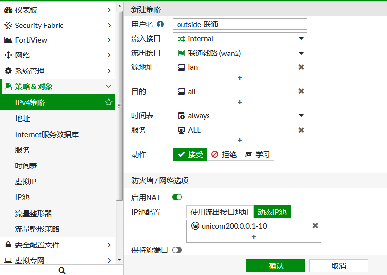 "启用NAT", 勾选" 动态IP地址池",并选择相应的地址池 unicom200.0.0.1-10进行互联网访问。