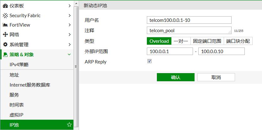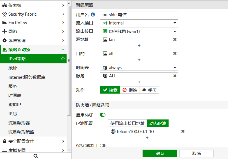 NAT: 选择 "启用NAT", 勾选" 动态IP地址池",并选择相应的地址池 telecom100.0.0.1-10进行互联网访问。