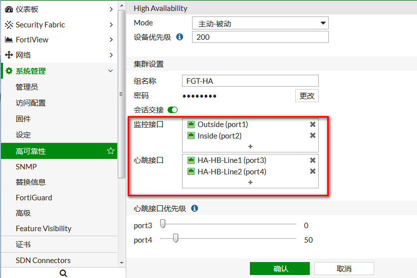 a)连接心跳线,FGT-主的port3、port4,连接到 FGT-从的port3、port4;