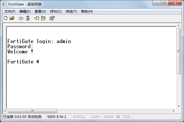 按回车键,则会打印出FortiGate login: 提示输入用户名及密码(设备出厂默认用户名为admin密码为空,如果密码有改过,且忘记了,此时可参考"系统管理>密码恢复")