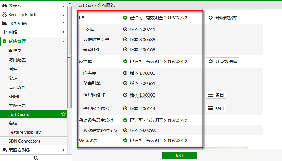 进入"系统管理"--"FortiGuard"确认所有的特征库均已升级成功,确认更新日期: