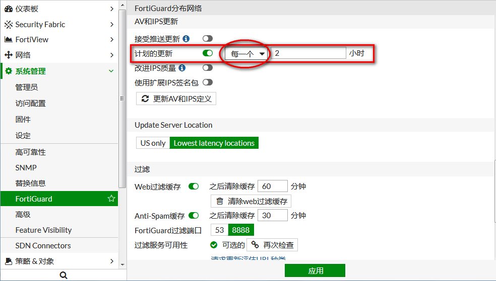 进入"系统管理"--"FortiGuard",勾选"计划的更新",并设置每一个2小时更新。