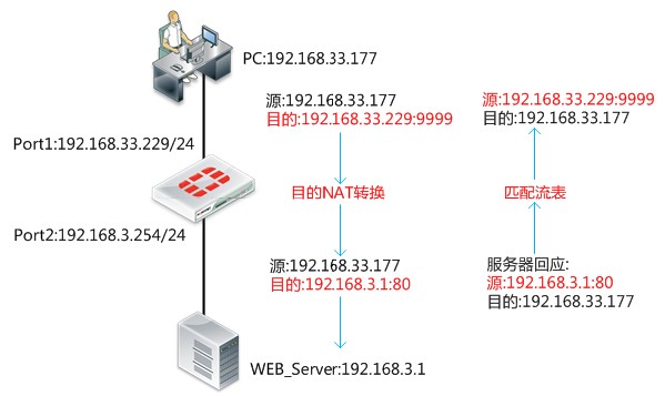 a、内网PC发出的源IP为192.168.3.20,目的IP为192.168.33.229,数据到FortiGate后,将源IP转换为内网口IP地址192.168.3.254,目的IP转换为192.168.3.1,(注意目的端口也由9999变为80).