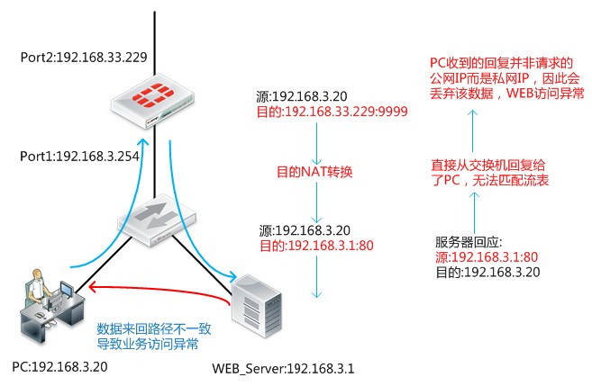 2、内网用户192.168.3.20通过公网地址192.168.33.229访问服务器的数据过程需保证来回路径一致,所以需要配置源NAT转换也需要配置目的NAT转换: