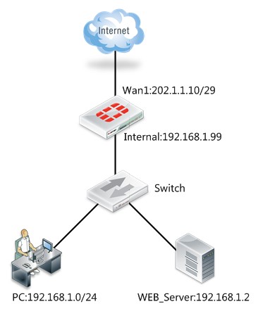 如下图所示,用户已完成了防火墙基础配置,现在需要将内网的一台web服务器(192.168.1.2)需要全映射到外网口的地址(202.1.1.11),让外网的用户能访问到此服务器。