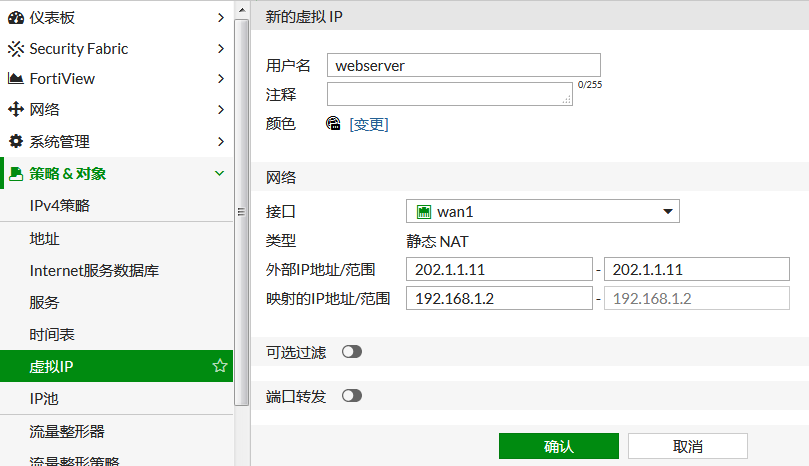 配置虚拟IP:名称为webserver,用于wan1口的