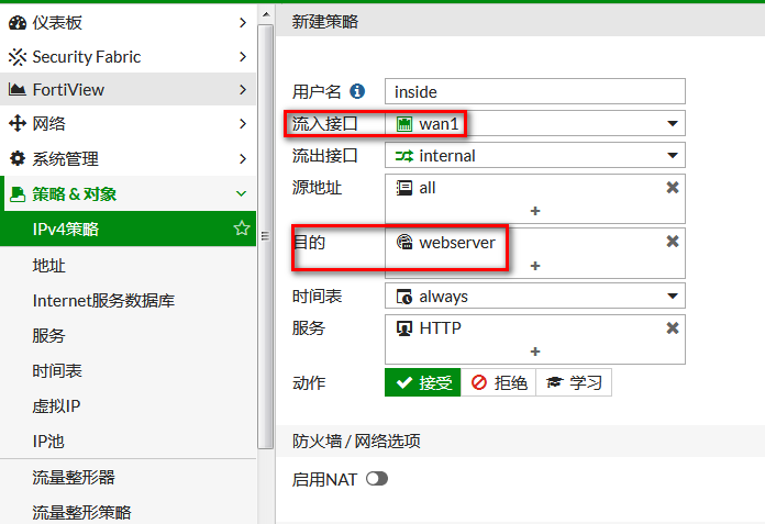 目的地址选择: webserver //定义好的虚拟IP映射对象