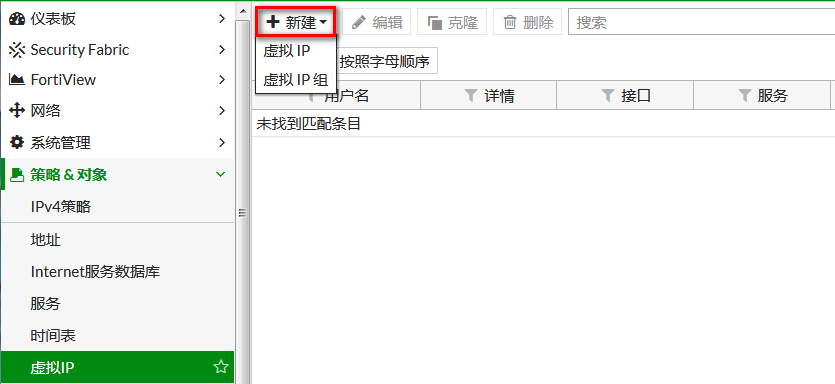 进入菜单:策略&对象--虚拟IP,点击"新建"。