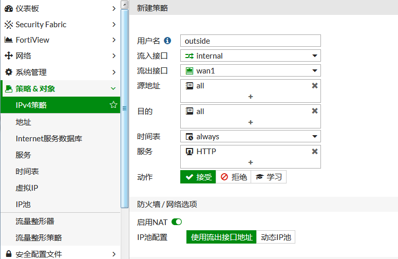 进入菜单:策略&对象--IPv4策略,点击 新建,按如下方式添加策略