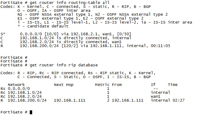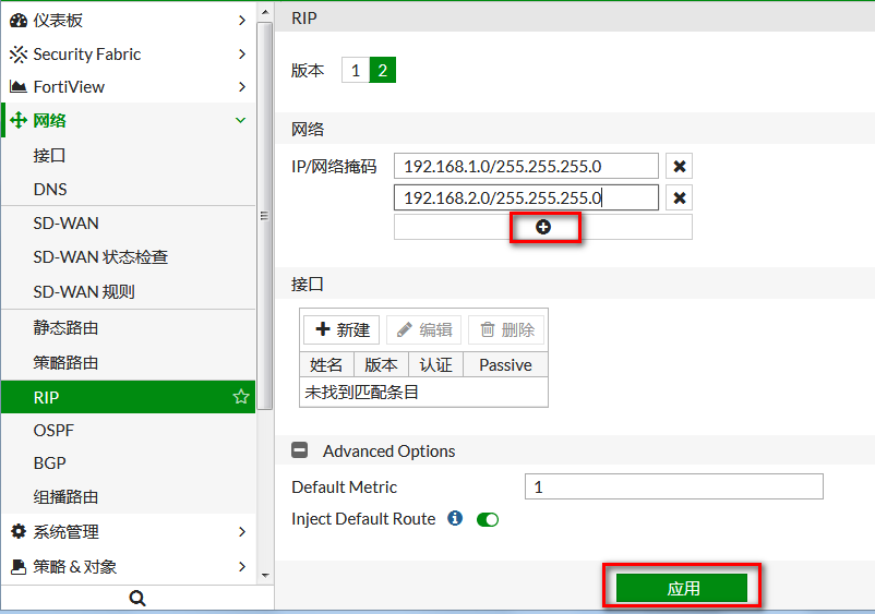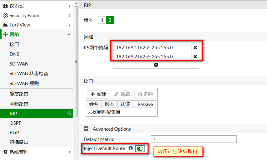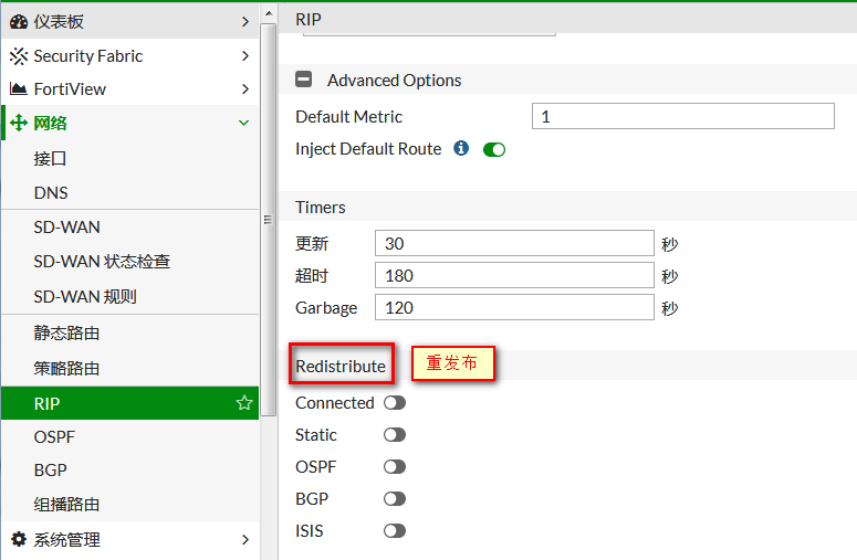 当网络路由设备较多,且不超过16个,为避免写大量静态路由,且路由可自动学习,可在FortiGate上配置RIP路由协议,让FortiGate也能动态学习到其他网络的路由,且能自动老化更新。