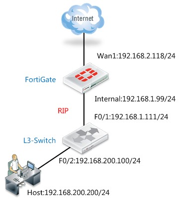 如图所示:内网三层交换机和出口FortiGate间通过动态路由RIP互相通告路由,实现内网用户正常上网。