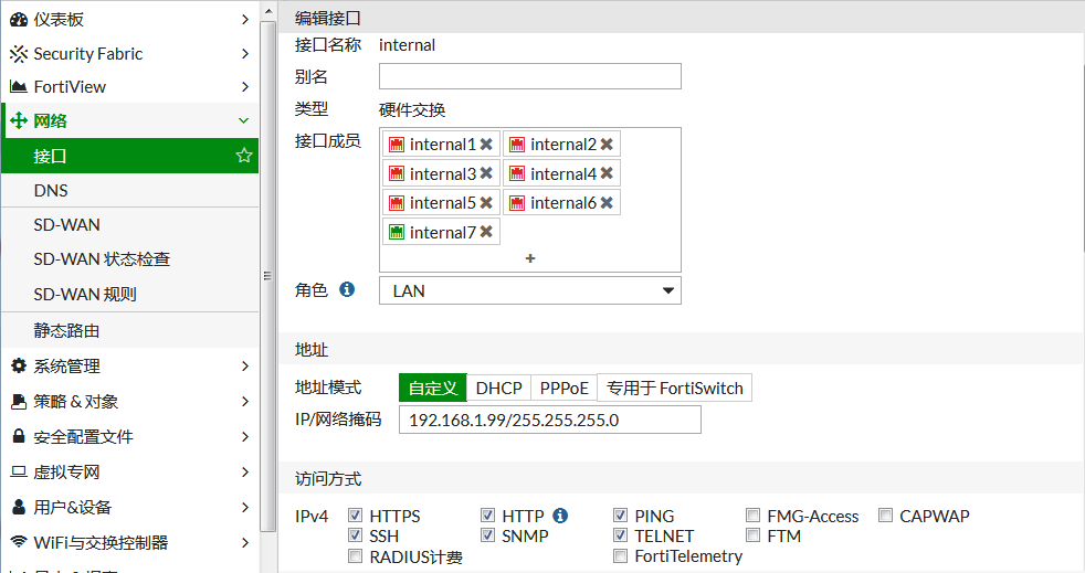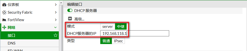 在FortiGate上开启dhcp中继,让内网电脑能获取来自专门DHCP服务器分配的地址。